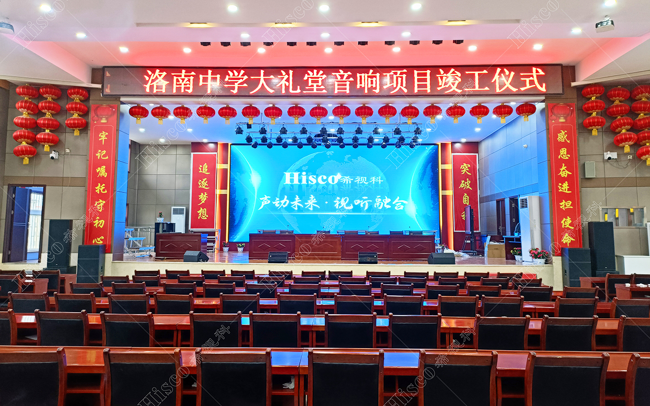 本校报告厅是一个中大型报告厅,主要为举办学校学术会议、演讲、公共大课培训及各种文艺演出,根据其建筑结构特点和使用功能及国家相关标准,根据面积和观看距离选择合适的LED大屏,展现整个舞台的宏伟大气;扩声采用集中与扩散相结合的扩声方式,开会和报告时采用单声道集中扩声还原模式,所有音源都从主席台发出,声像的平衡、方位无倾斜,保证了下面学生听到的直达声响度和均匀度达到要求,让学生听的适宜和舒服。演出时采用左右立体声空间成像模式,直达声与辅助音箱的效果声相结合表演,传达表演意境,使得演员和观众之间产生一种无声的交流。